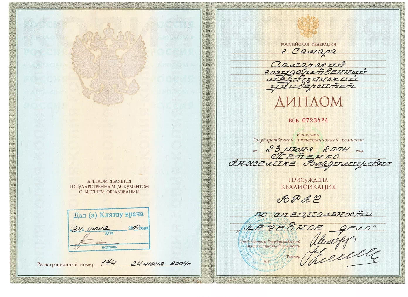 • 2004 — Самарский государственный медицинский университет (квалификация: по направлению "Лечебное дело");
